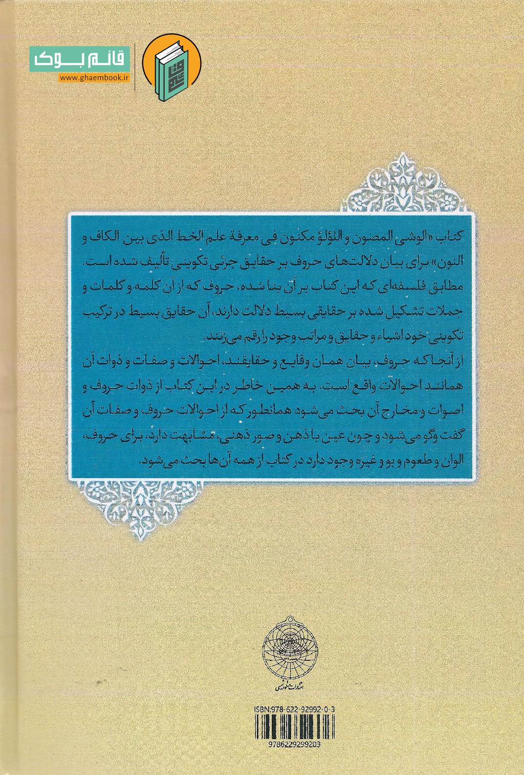 کتاب: ترجمه و شرح الوشی المصون و اللؤلؤ المکنون فی معرفة علم الخط الذی بین الکاف و النون هو علم حروف علمى بسیار شریف و عزیز است. عالمان به علم حروف را در حروف نوزده گانه (بسم الله الرحمن الرحیم) ، و در وضع جداول اوفاقى آن اسرار و لطایف شگفت است . اسرار حروف جدا شگفت آور است. و آقایانی که تفسیر انفسی بر قرآن نوشتند باید دانست که آنان به این علم عجیب عنایت دارند و امم این سلسله ی عرفا بسیاری از رمز و راز های قرآن را بر اساس این دانش شریف بیان می کنند ، جناب سید حیدر آملی در تفسیر خود که تفسیر انفسی است بسیار به علم حروف عنایت دارند.